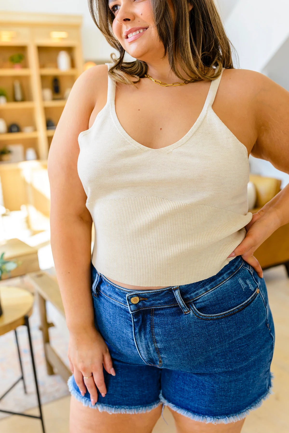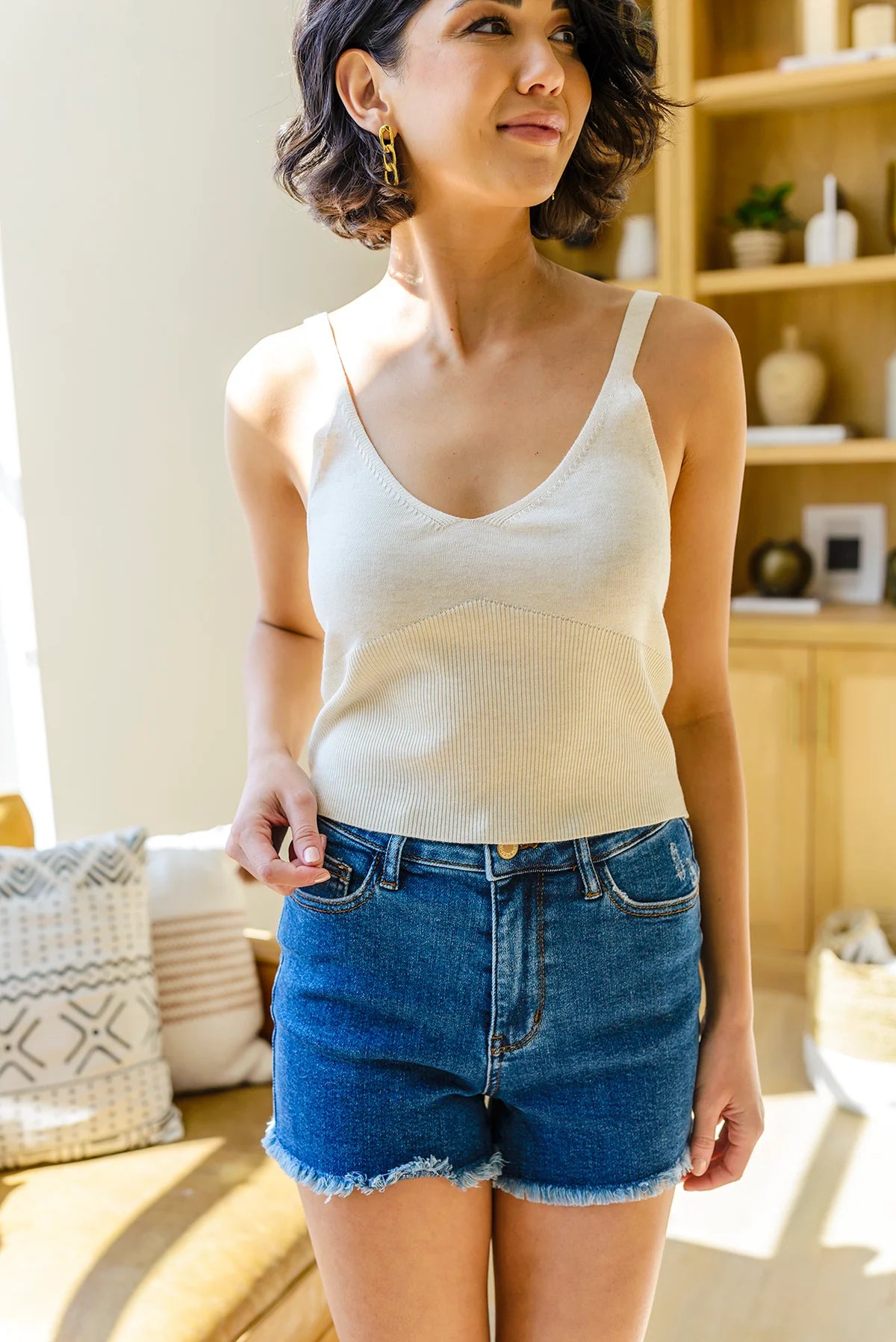 Get your summer wardrobe ready with the Best Part Tank In White! This lightweight knit tank features a v-neckline, spaghetti straps, ribbed bodice, and slightly cropped silhouette. We're obsessing over the fact that we can now wear knits year round! Pair this perfect tank with some wide leg jeans and sneakers for a casual & chic look!